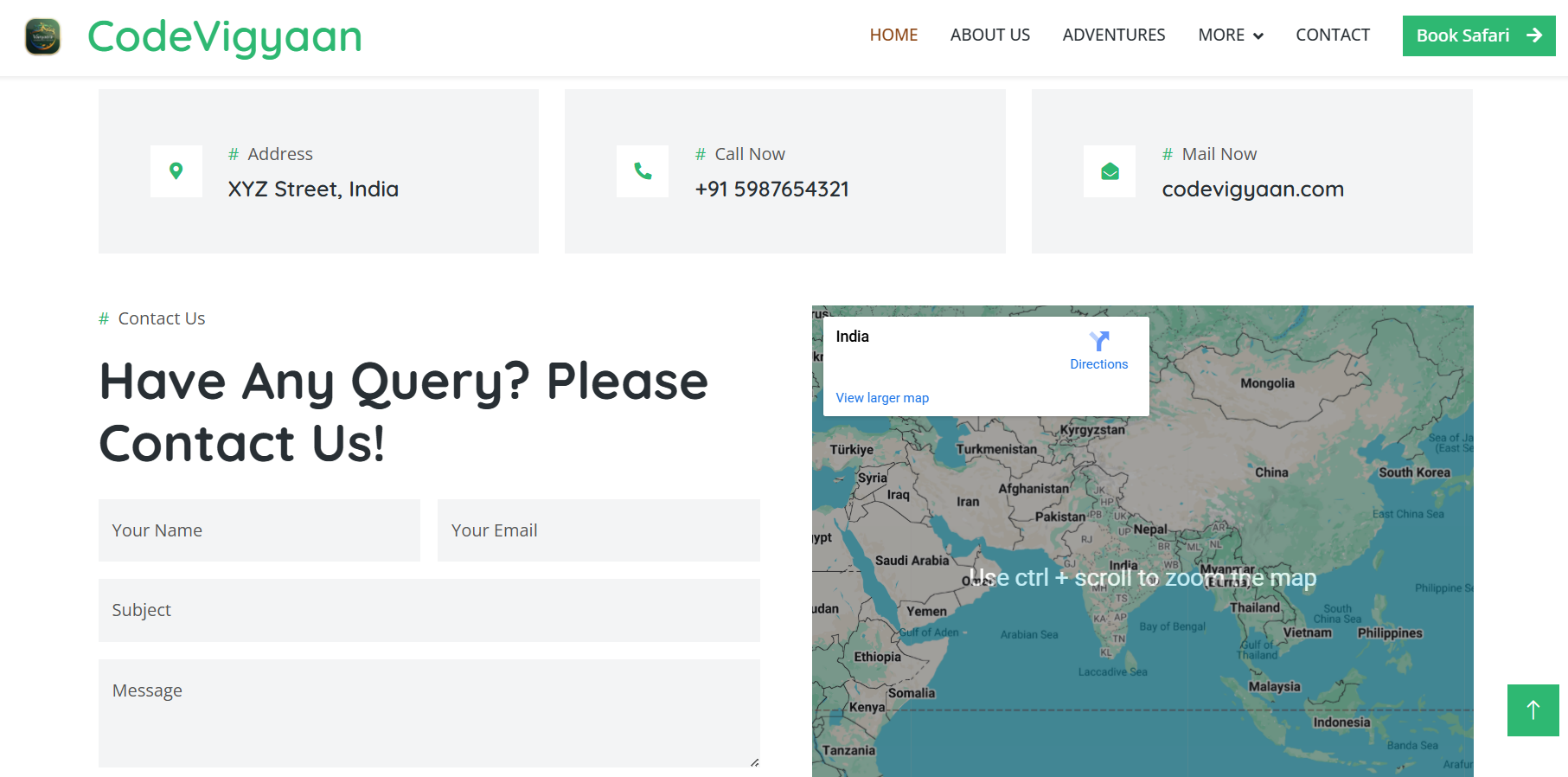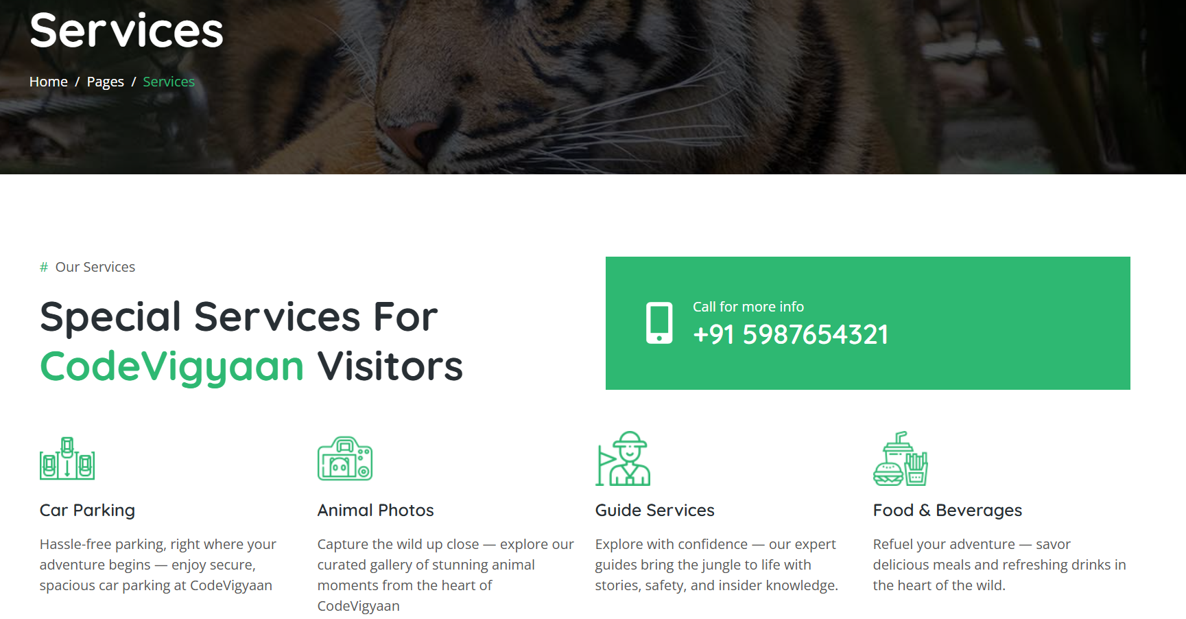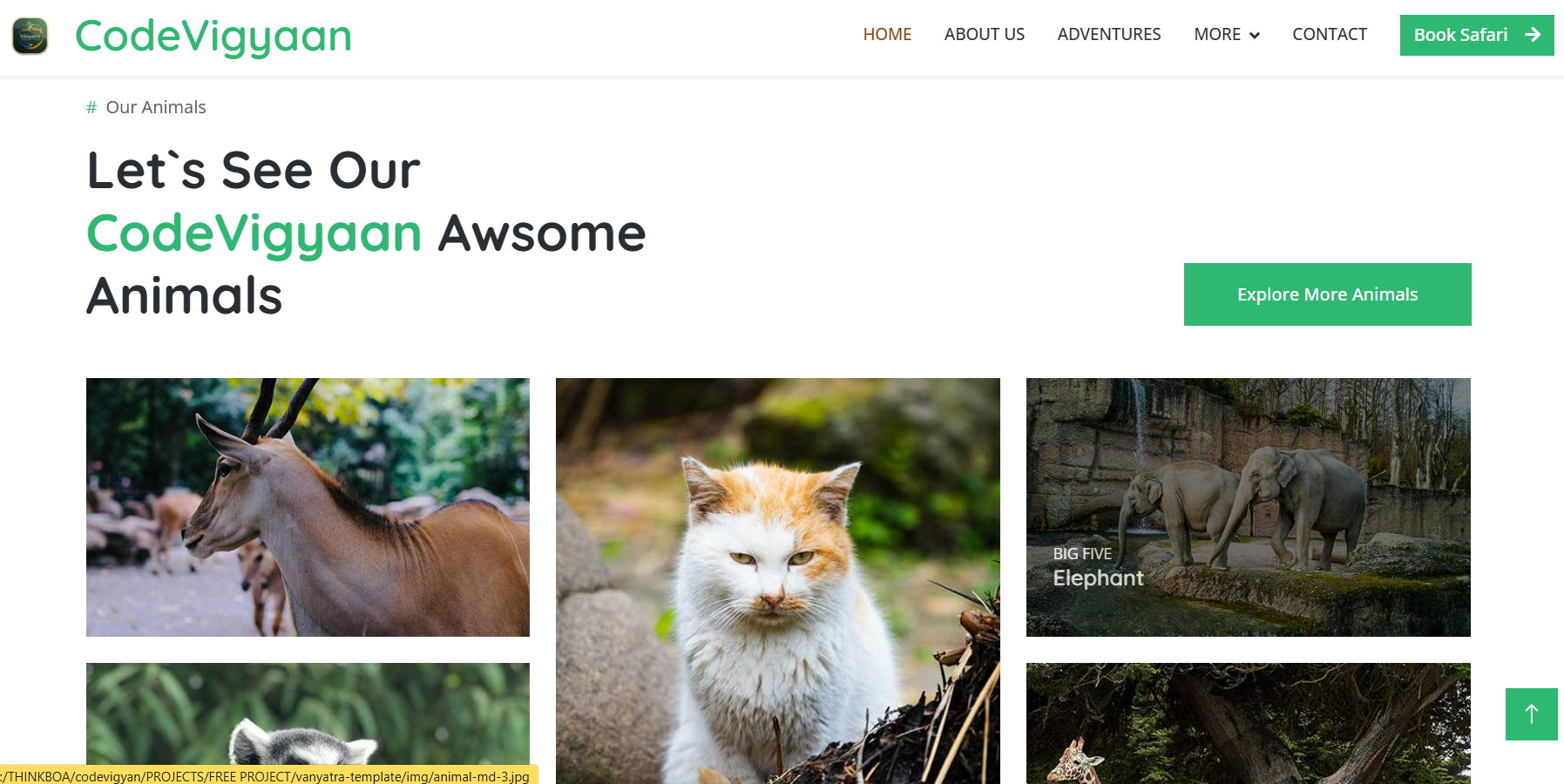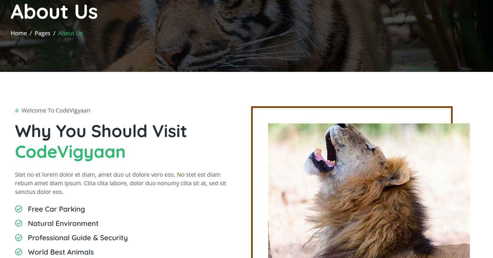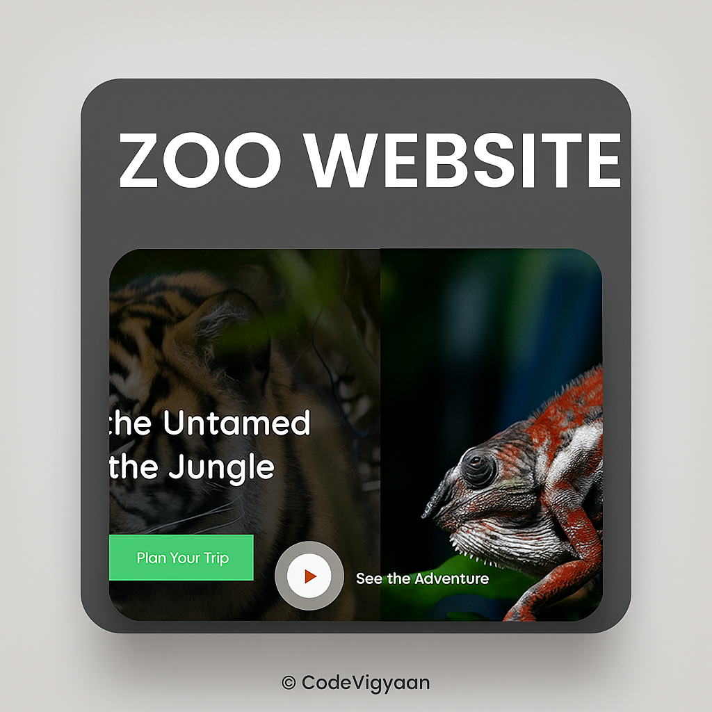 BOOTSTRAP ZOO WEBSITE is a premium, responsive frontend template using HTML, CSS, JavaScript, Bootstrap CDN, jQuery CDN, and JS CDNs. Ideal for zoos or wildlife sites, it features animal galleries, visitor info, events, and full mobile optimization—perfect for students’ college projects, freshers’ portfolios, or educational use on CodeVigyaan.