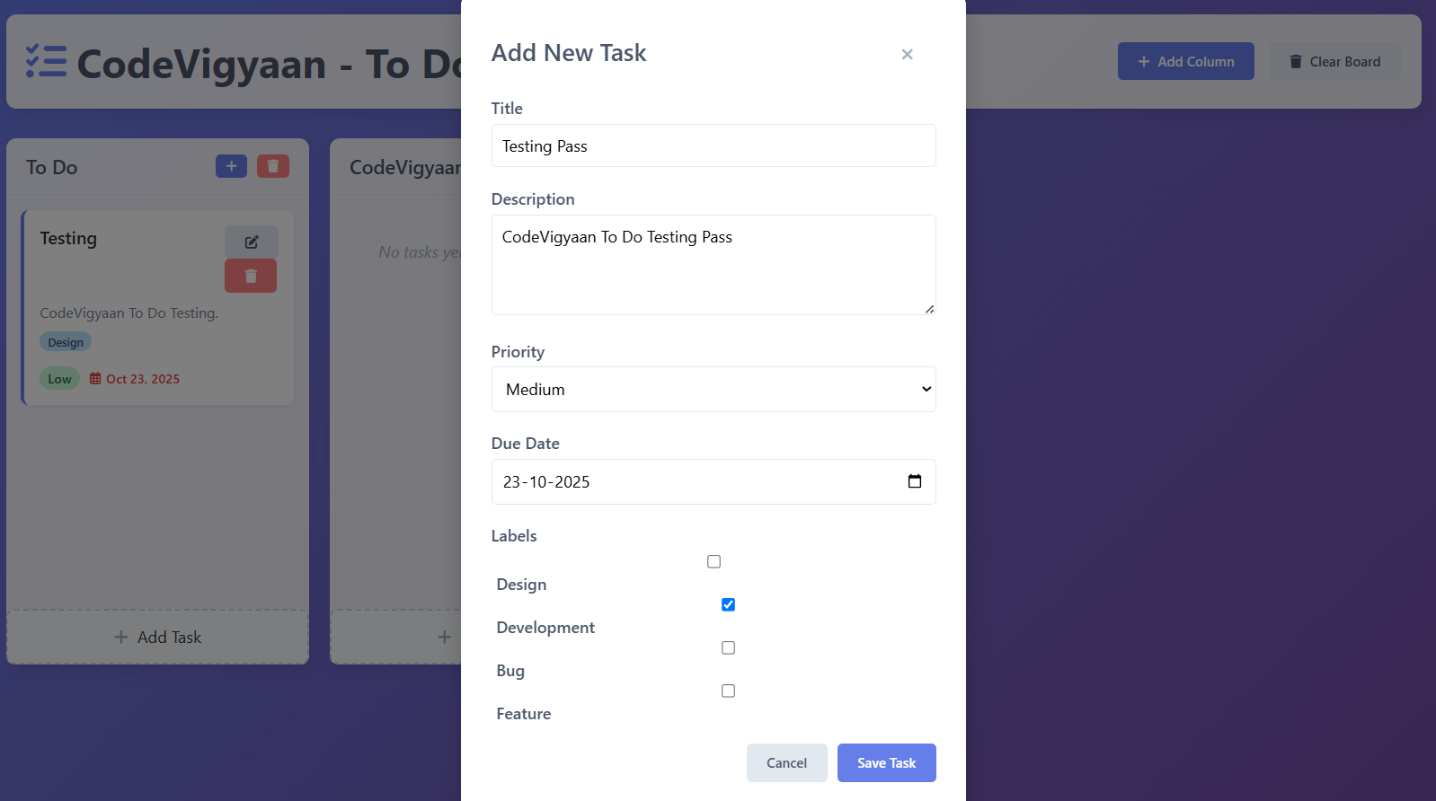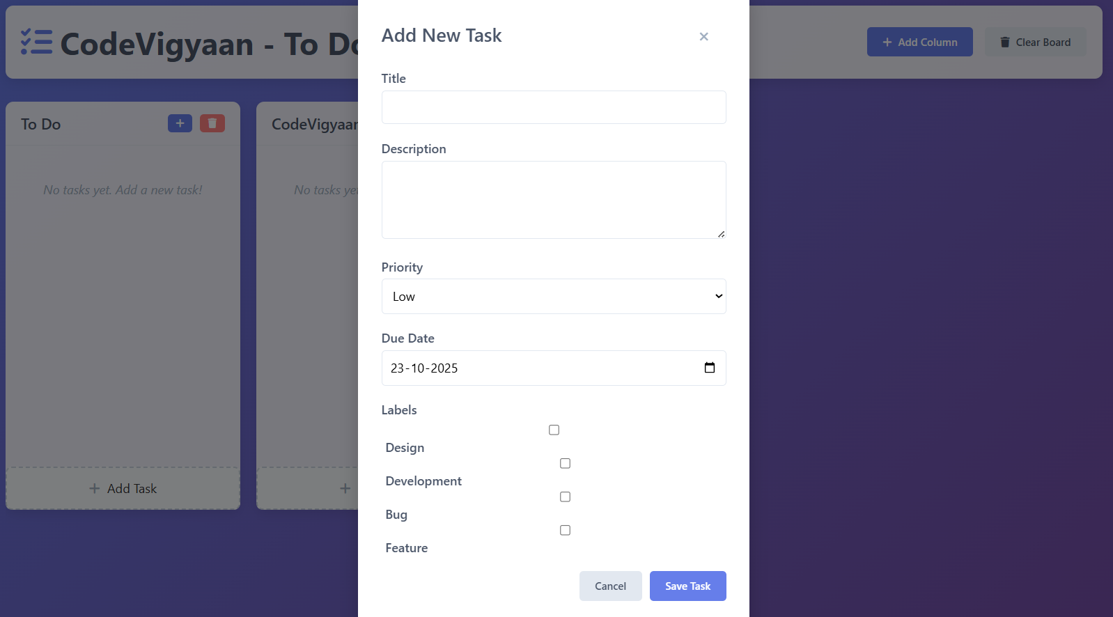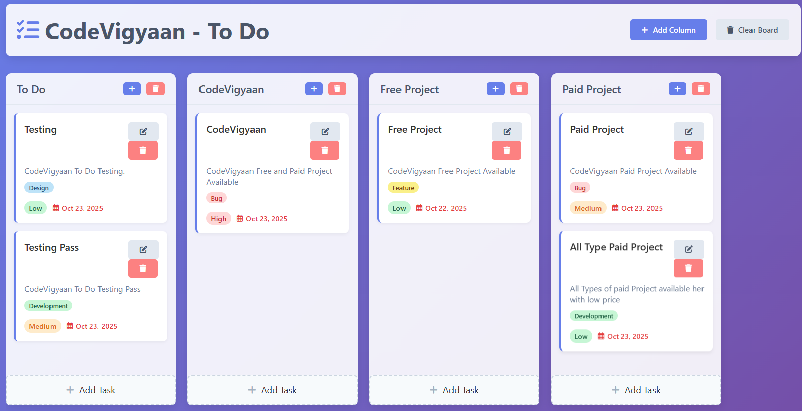 Provided by CodeVigyaan as a complimentary resource, this project is freely available for download on the platform, enabling anyone—students, professionals, or hobbyists—to use, modify, and deploy it at zero cost. It’s particularly suited for educational scenarios: students can incorporate it into college submissions to illustrate JavaScript fundamentals, freshers can feature it in portfolios to demonstrate core web development skills, and learners can dissect the code for hands-on practice. The app features a clean, responsive interface with drag-and-drop elements (if extended) and customizable themes.