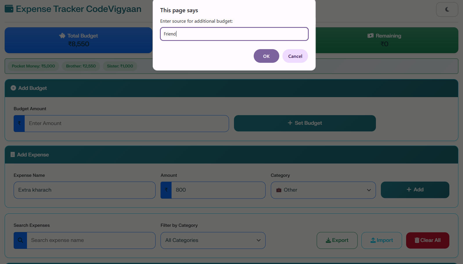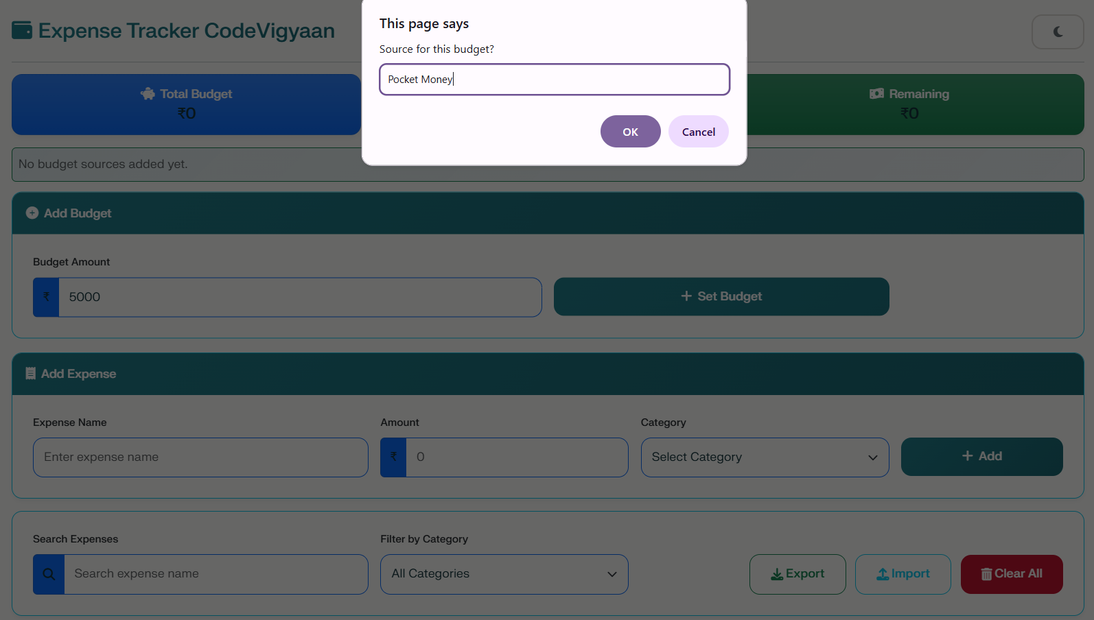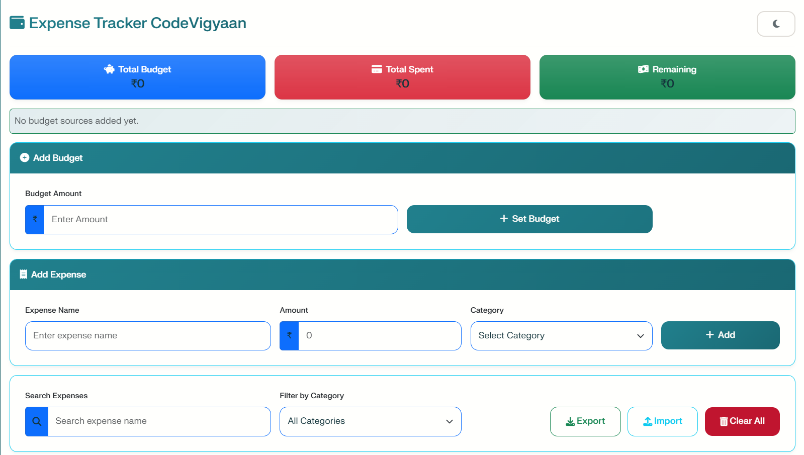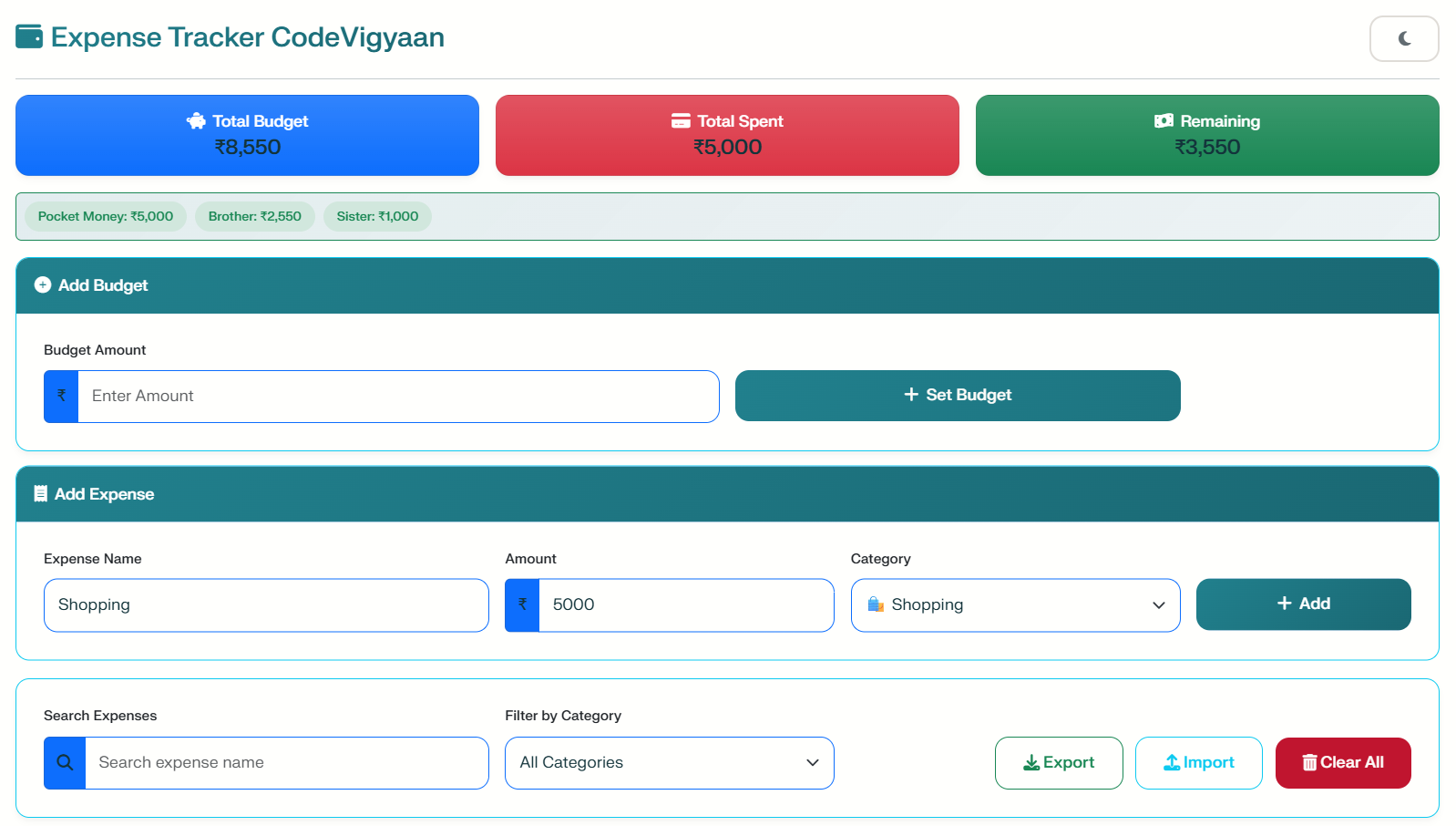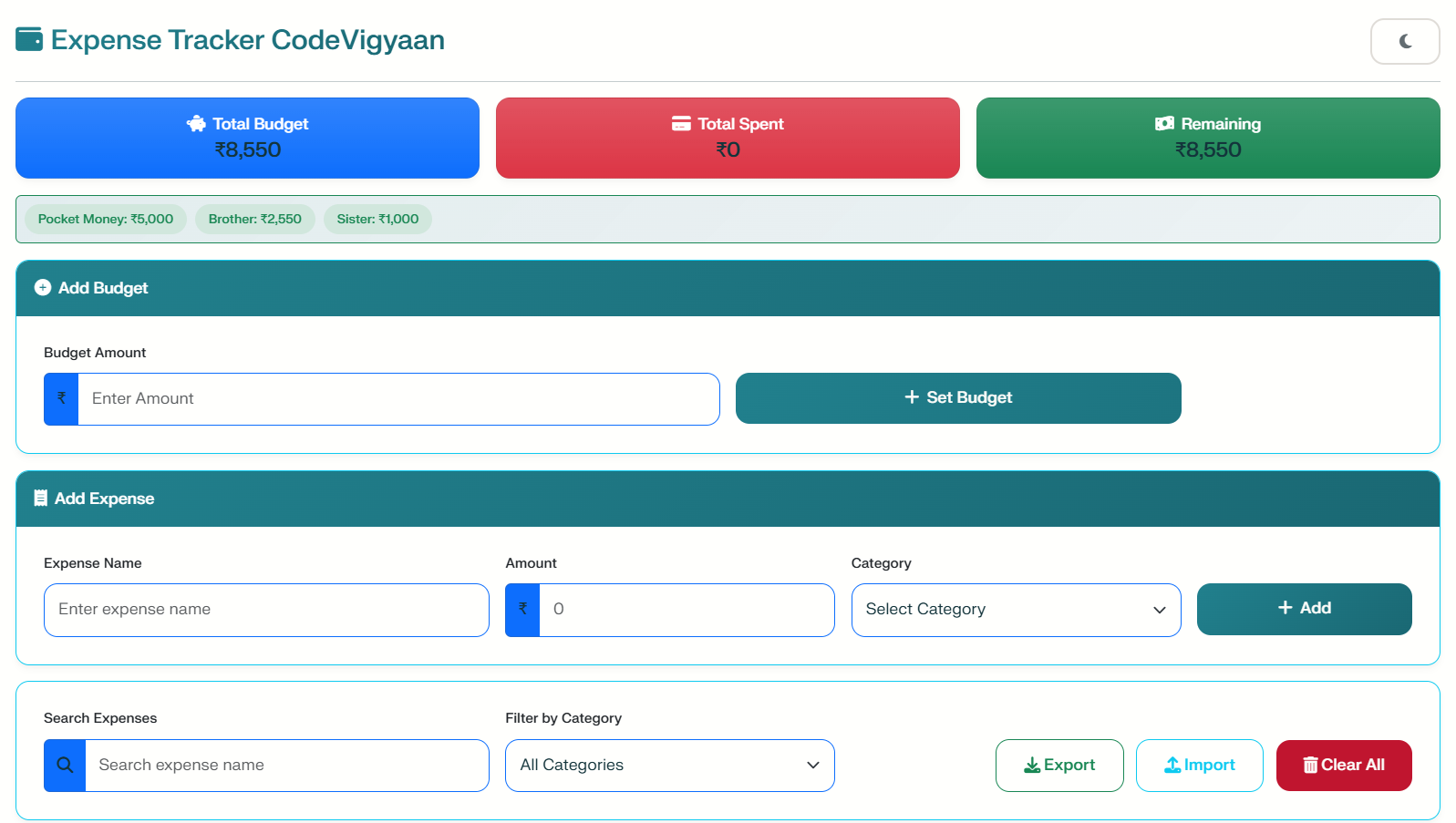 The application allows users to set budgets and add expenses with specific categories. Consequently, you can track your spending in real-time and visualize your habits through interactive charts. Because it focuses on simplicity, the app stores all data locally using browser storage. As a result, there is no need for complex servers or databases, making the project lightweight and easy to deploy.