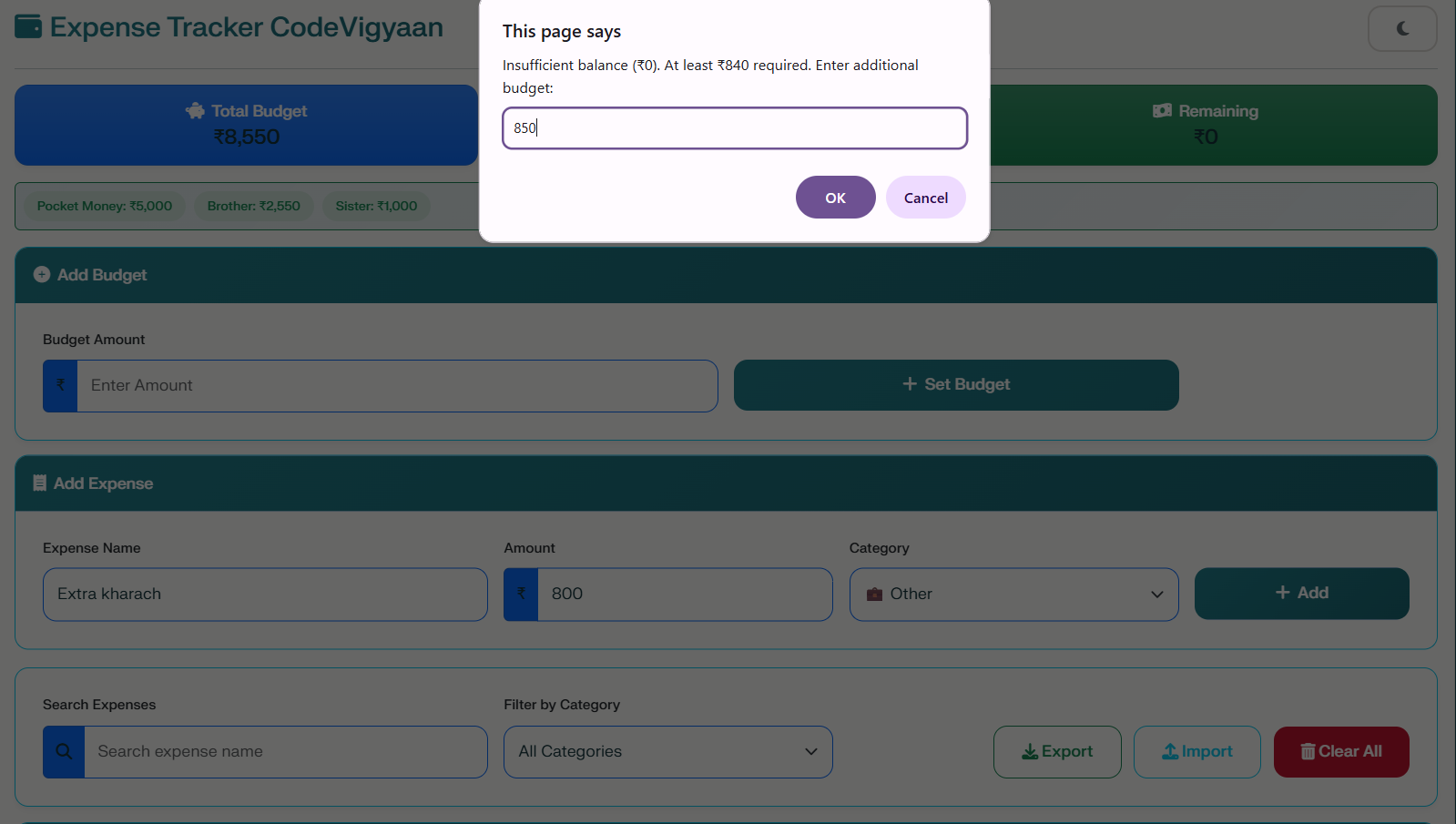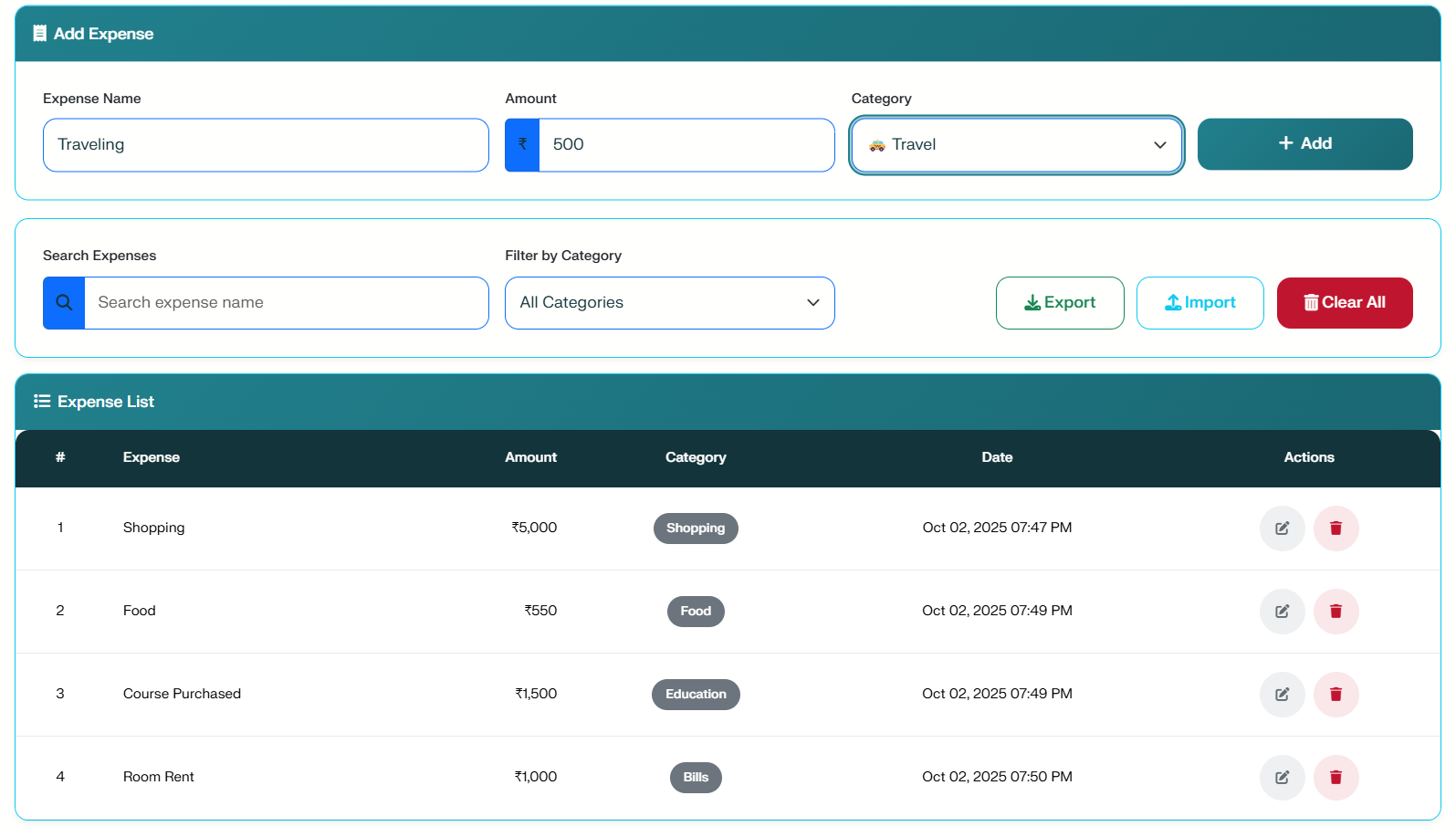 The primary goal of this project is to provide a user-friendly interface for expense management. Specifically, it enables users to track and optimize their monthly budgets. In addition, the app facilitates detailed reporting of expenses by category and date. We also ensured that the design is fully responsive on all device sizes, including mobile and tablets. This allows for secure data sharing through easy import and export functions.
