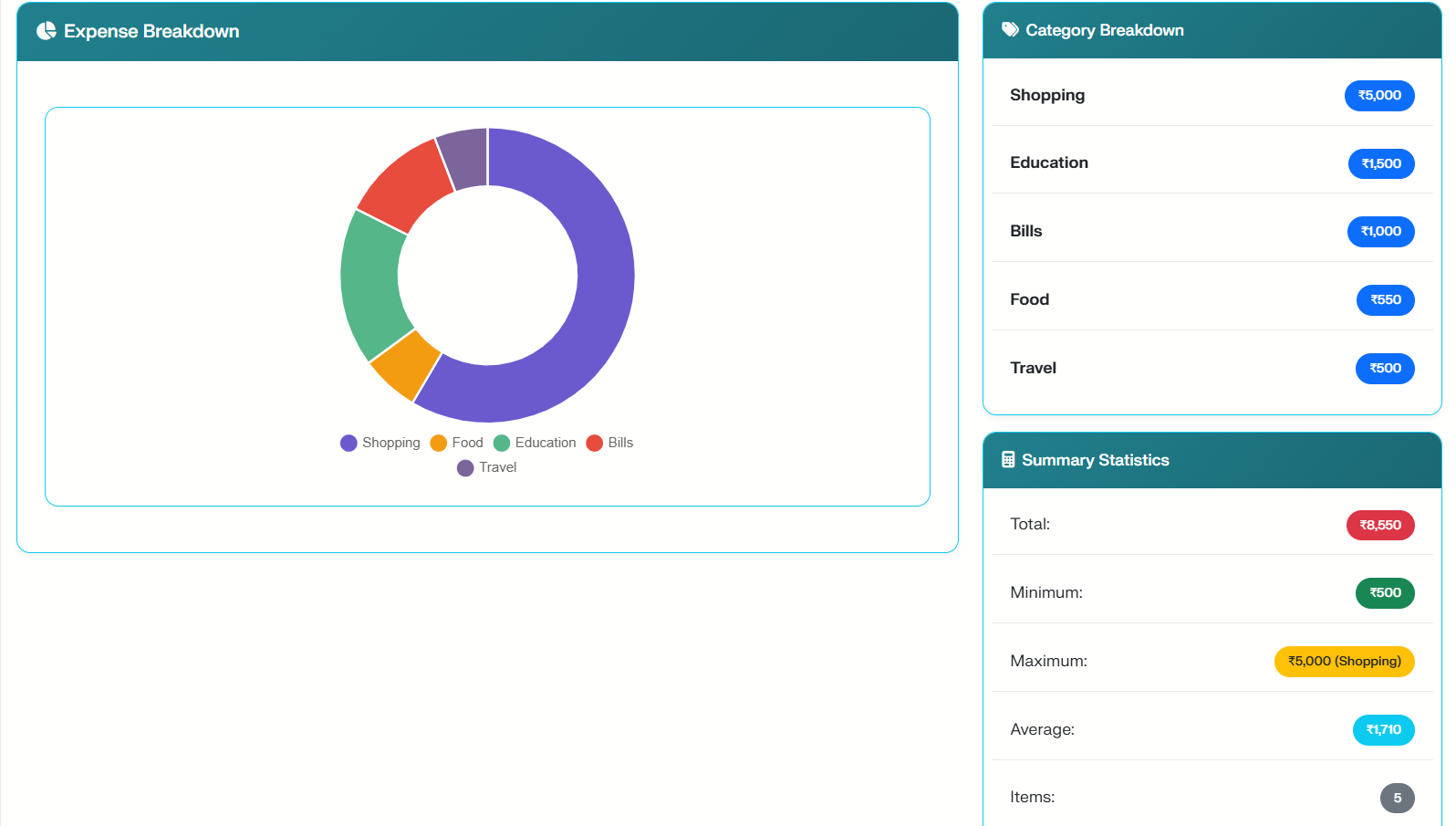 Interactive Visuals: See your spending breakdown using professional Chart.js visualizations.